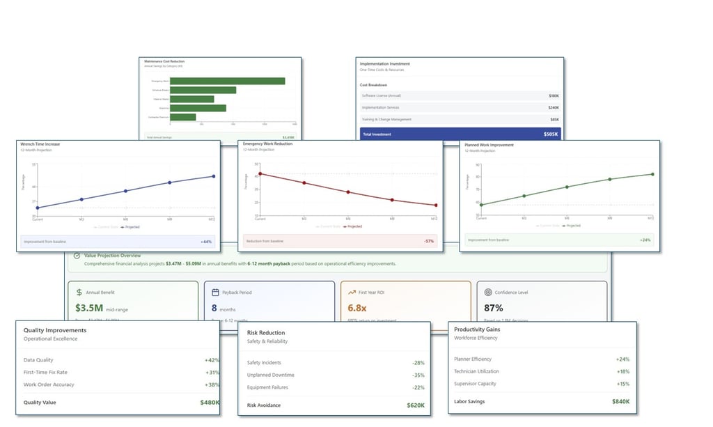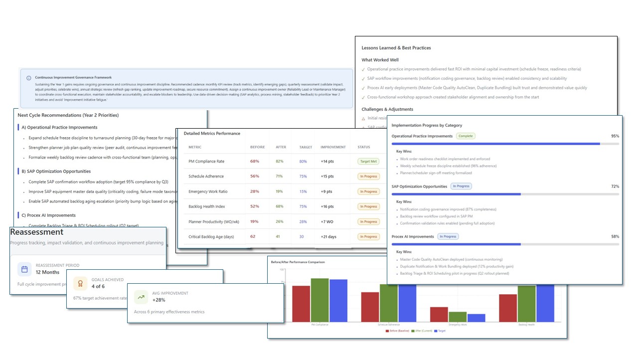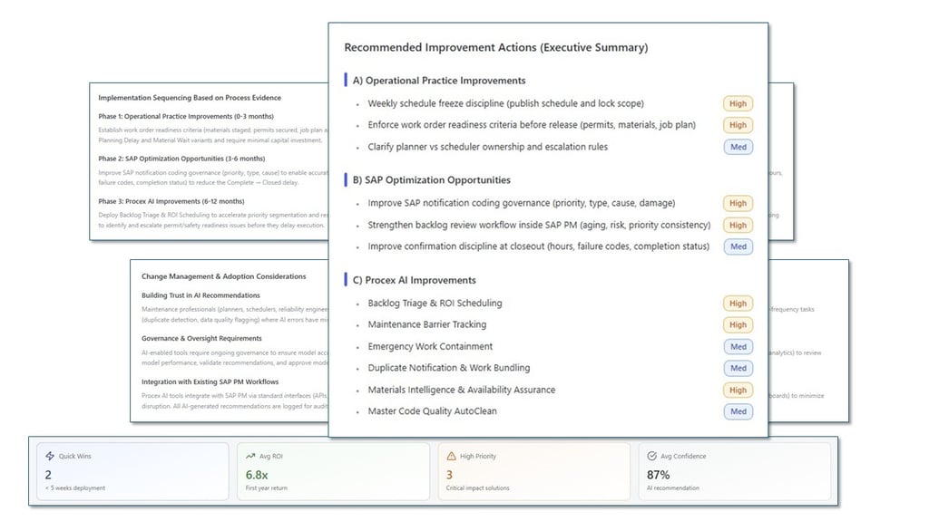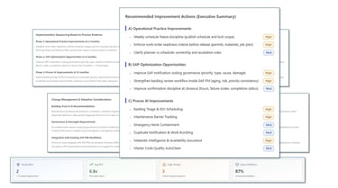 It continuously evaluates maintenance execution across SAP EAM processes, correlating transactional activity, performance KPIs, and operational context to identify where intervention will deliver measurable improvement.